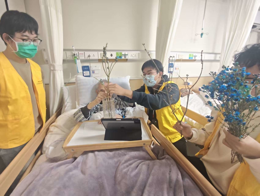 12月16日,正值大雪和冬至节气交汇的时节,病房里却暖意融融。孙航带领的志愿者团队走进病房,开启了首次“节气探访”服务。他们把节气的习俗、养生知识带进了病房,还带来了新鲜的腊梅,让患者闻花香、学插花,甚至试着跟老人们分享年轻人的流行词汇。孙航服务的是一位70多岁的上海阿姨,她通过平板让阿姨领略了上海近日几条“落叶不扫”街道的美景。“阿姨很健谈,还和我聊起了家事,她很想念她已经过世的妈妈。”孙航听着,也安慰着,“她能告诉我这些,说明我成功‘打开’她了。”